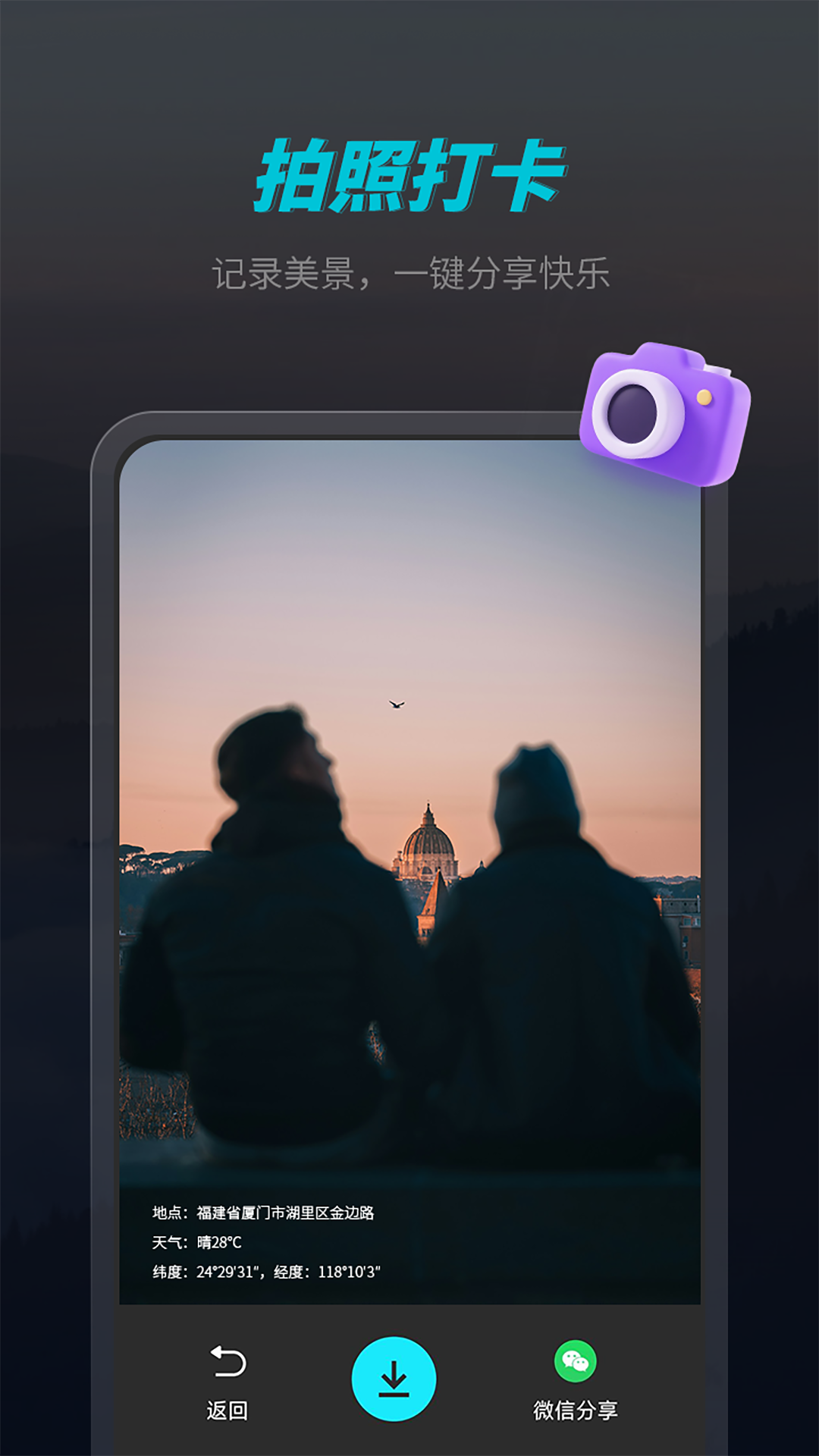 可显示当前位置、经纬度还能显示海拔高度、气压、磁场强度、水平倾斜角度、天气温度等气象状况!