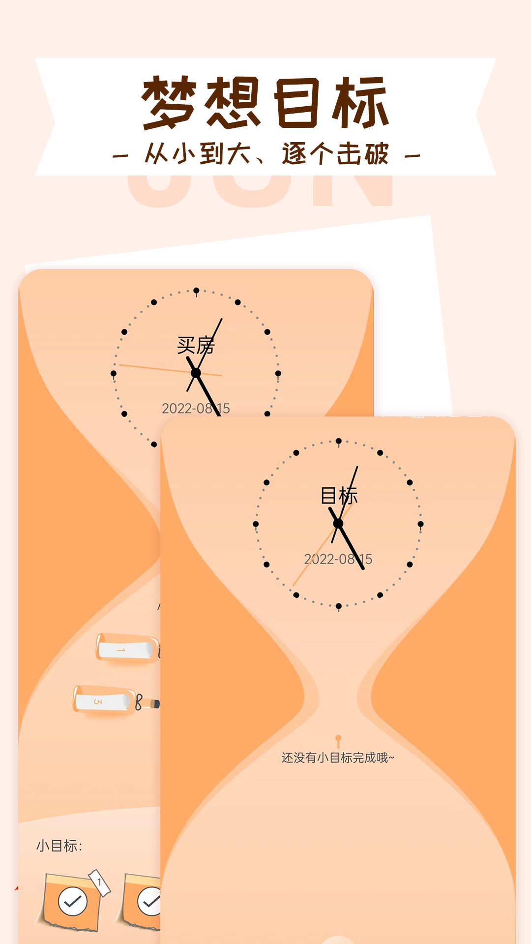 1,设置目标:不仅能添加子目标,还能设定结束时间,提醒时间,打卡成功提示等等,制定长期短期目标,给你满满坚持原动力,让你的每一步都走在实现目标的路上