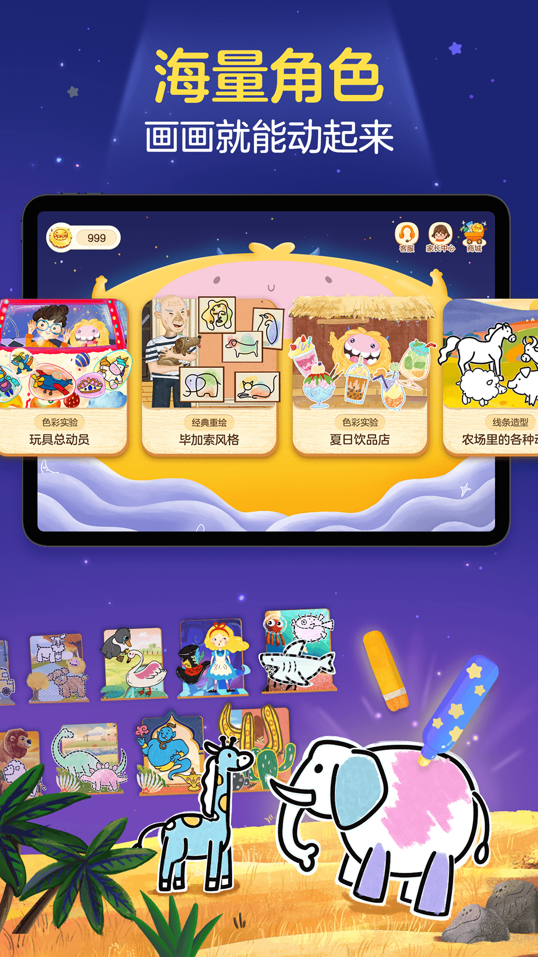 绘画主题丰富,主题内角色阶梯式难度递增,不定期为孩子开放铅笔、水彩、油画、蜡笔等绘画工具;