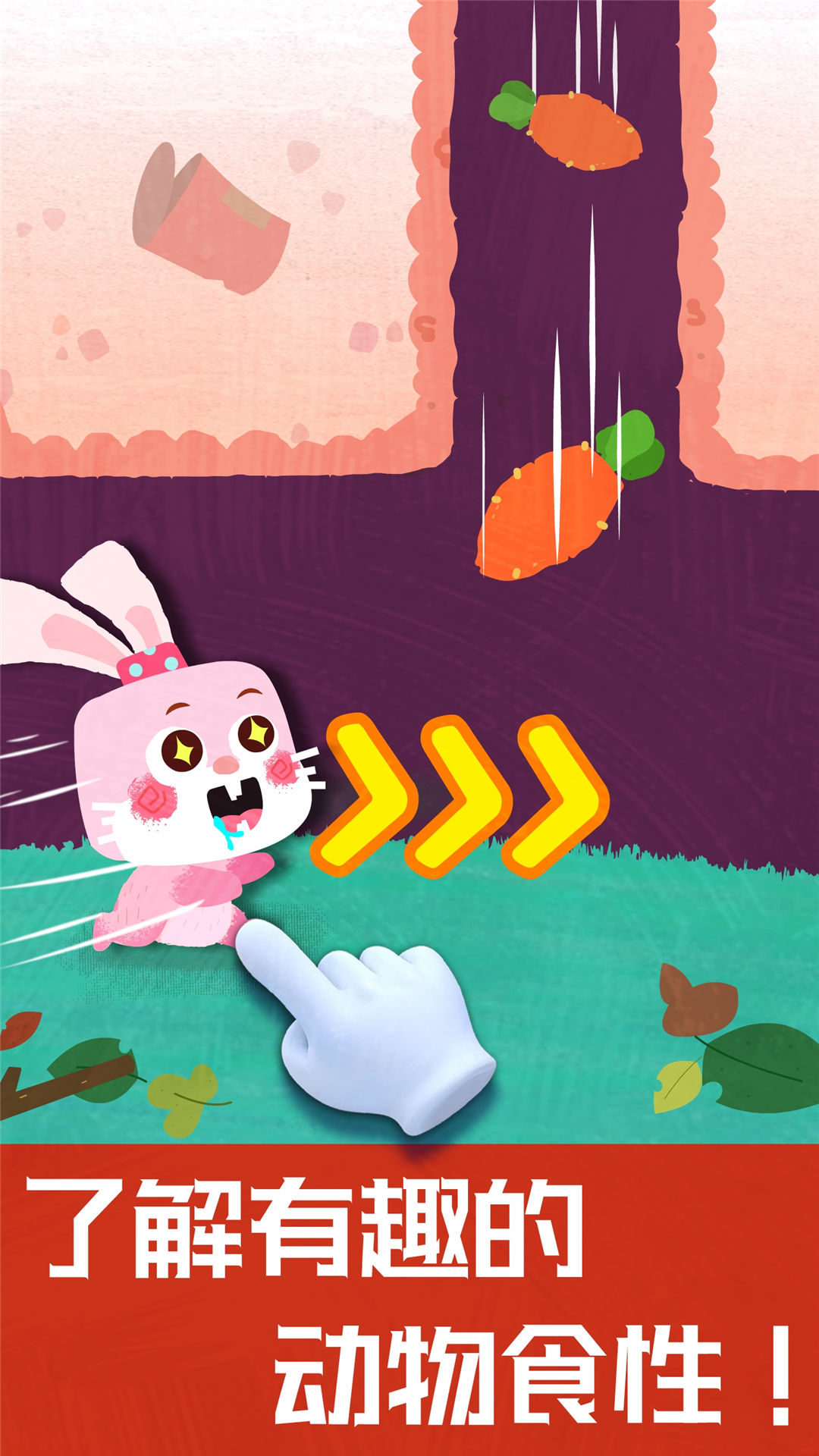 小兔子可喜欢吃胡萝卜啦。胡萝卜从洞口掉进来,小兔快跑,接住胡萝卜。有蛇出没,小兔要躲起来哦!鼹鼠肚子好饿呀,来帮它抓蚯蚓喽。