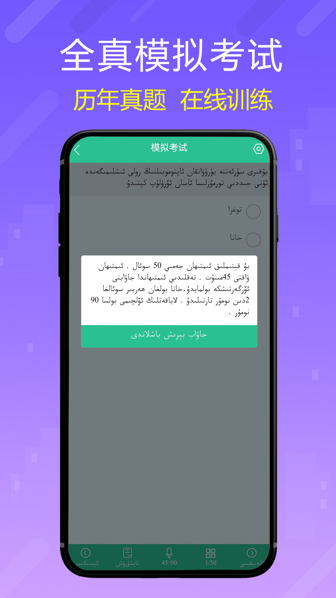 1、基础练习:维吾尔语翻译驾考题,维语翻译,维文题目,多种练习模式,分类练习帮助零基础学员了解考试内容;模拟考试帮助学员检验学习情况