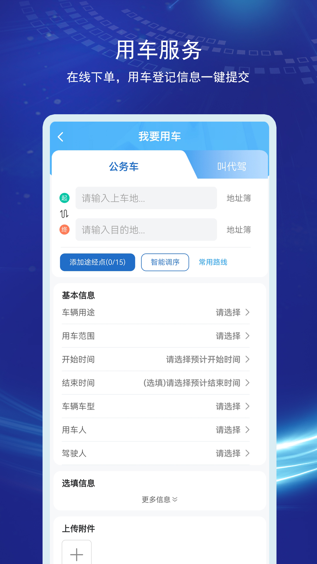 一键用车、高效调度、轨迹监控、出行记录、用车统计。