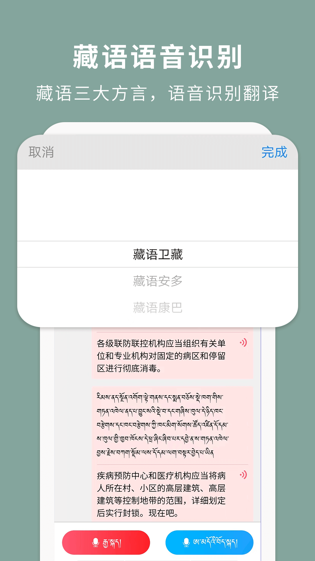 支持藏区三大方言(卫藏方言、康巴方言、安多方言)语音输入,面对面对着说话,语音识别翻译,发音不标准也能实现同声传译和对话翻译。