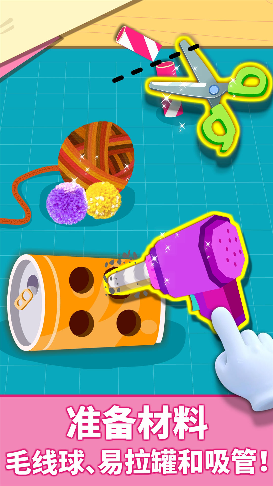 准备毛线团、瓶盖等。拿起锤子,将瓶盖敲平、涂抹胶水,再粘贴毛线,DIY出“炸毛”狮子头。接着,拼装狮子的身体吧!