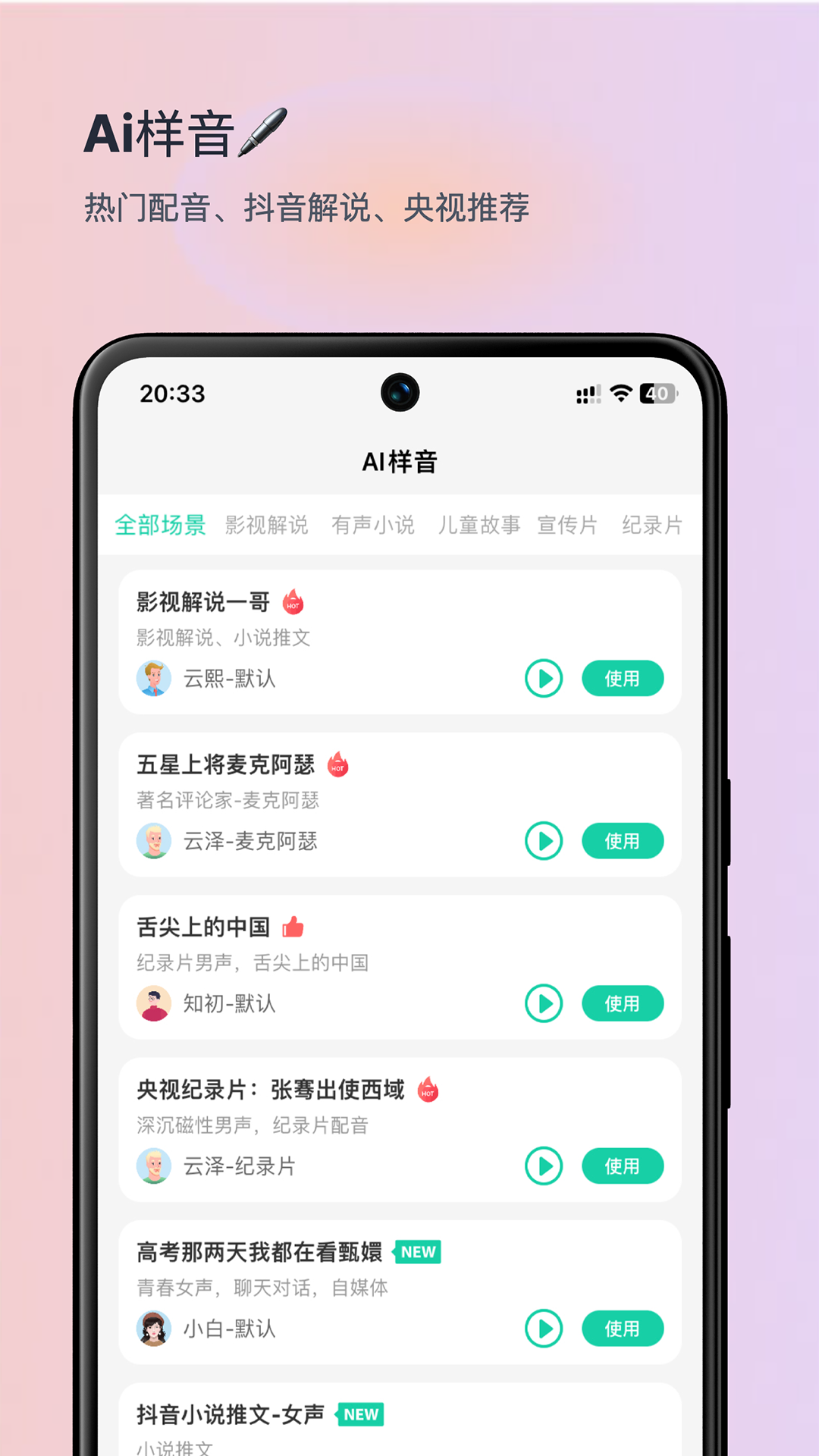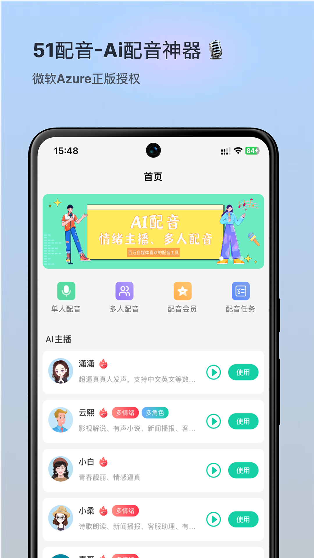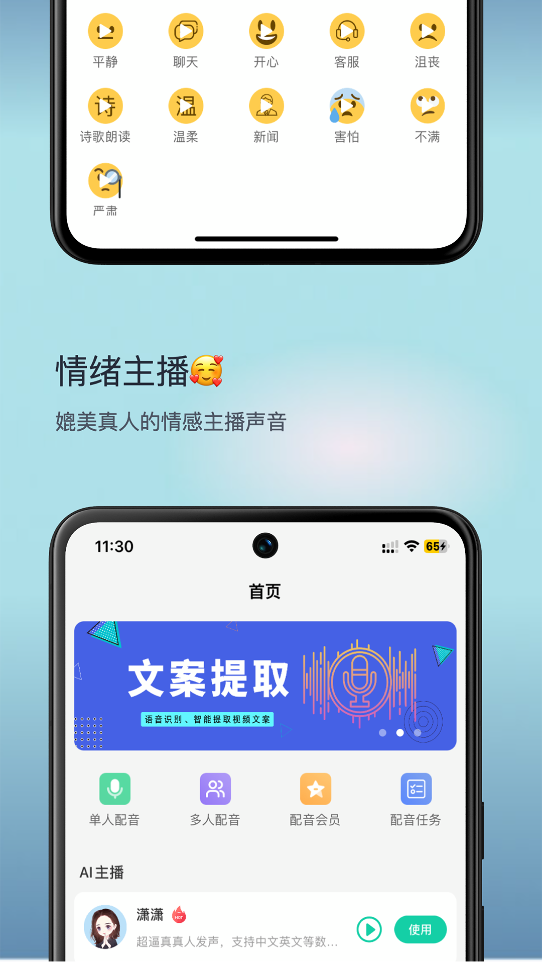 AI配音,拥有多款情绪丰富的AI主播,配音作品提供免费多平台同步,可以随时随地,在不同平台完成配音。