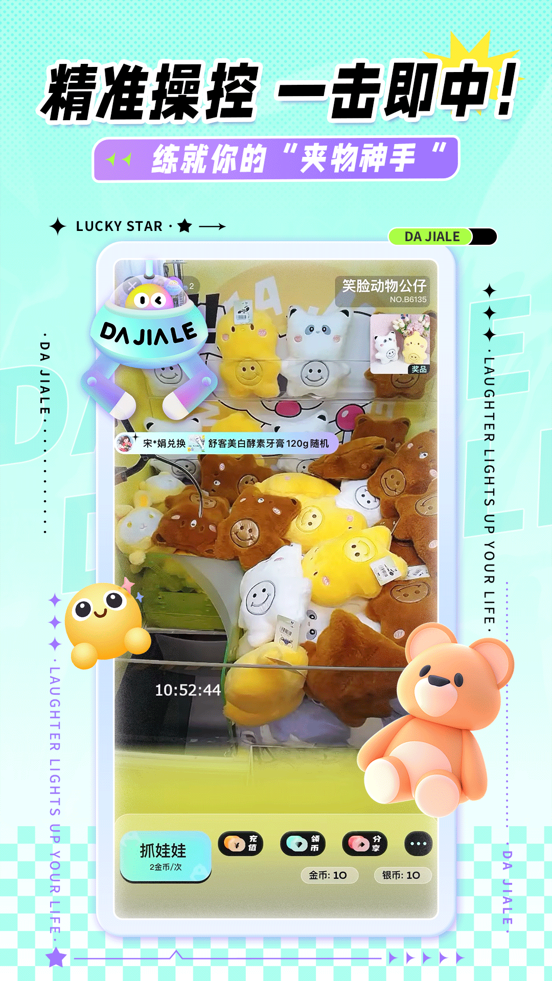大夹乐:一网打尽潮流玩品,萌娃玩具的潮玩平台!简单易夹,快乐带走,快递到家。超强力爪助你更容易夹中,无论新手还是大神,在家就能体验抓娃娃的快乐!新奇玩法,总有一种适合你,现在还有超多活动等你参加。