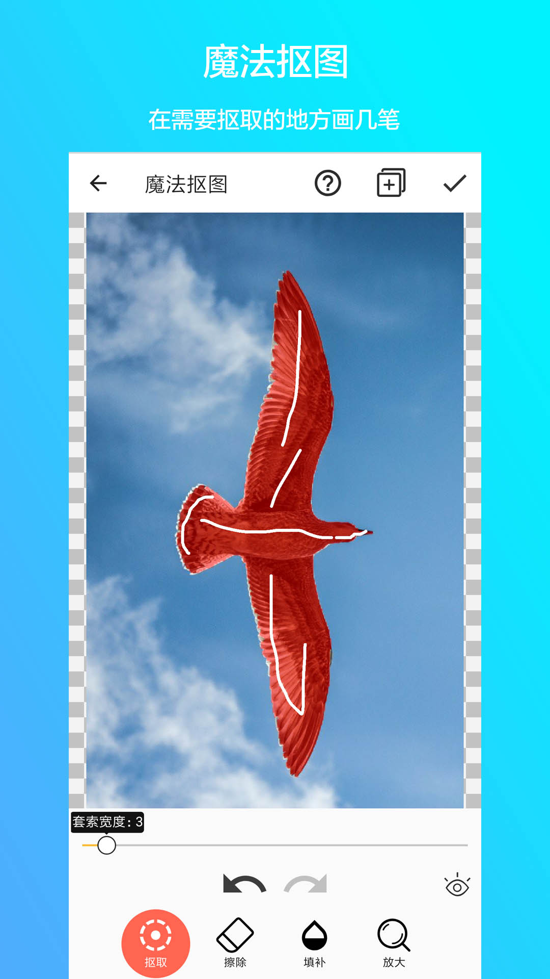 2、魔法抠图实现一键抠图,只需在要抠取的地方画一笔即可自动识别
