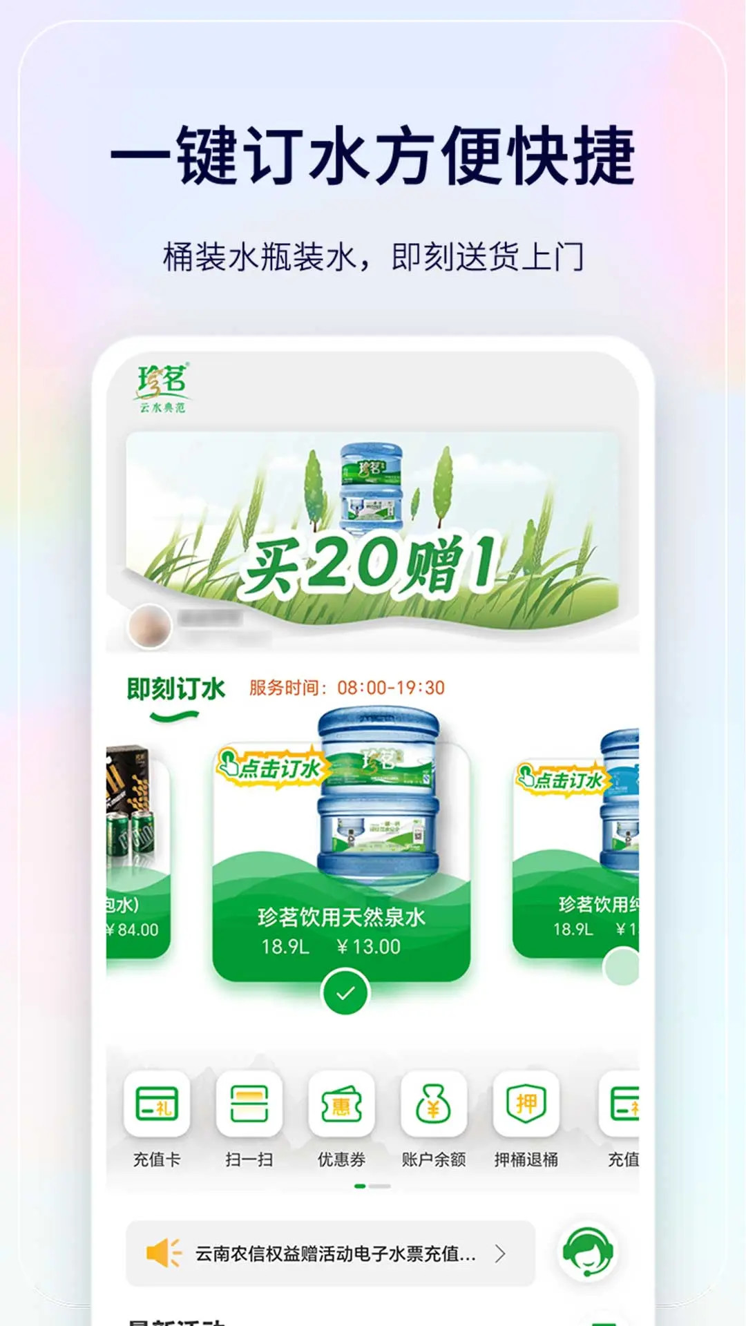 1、为用户提供订水、订票、订购水机等入口