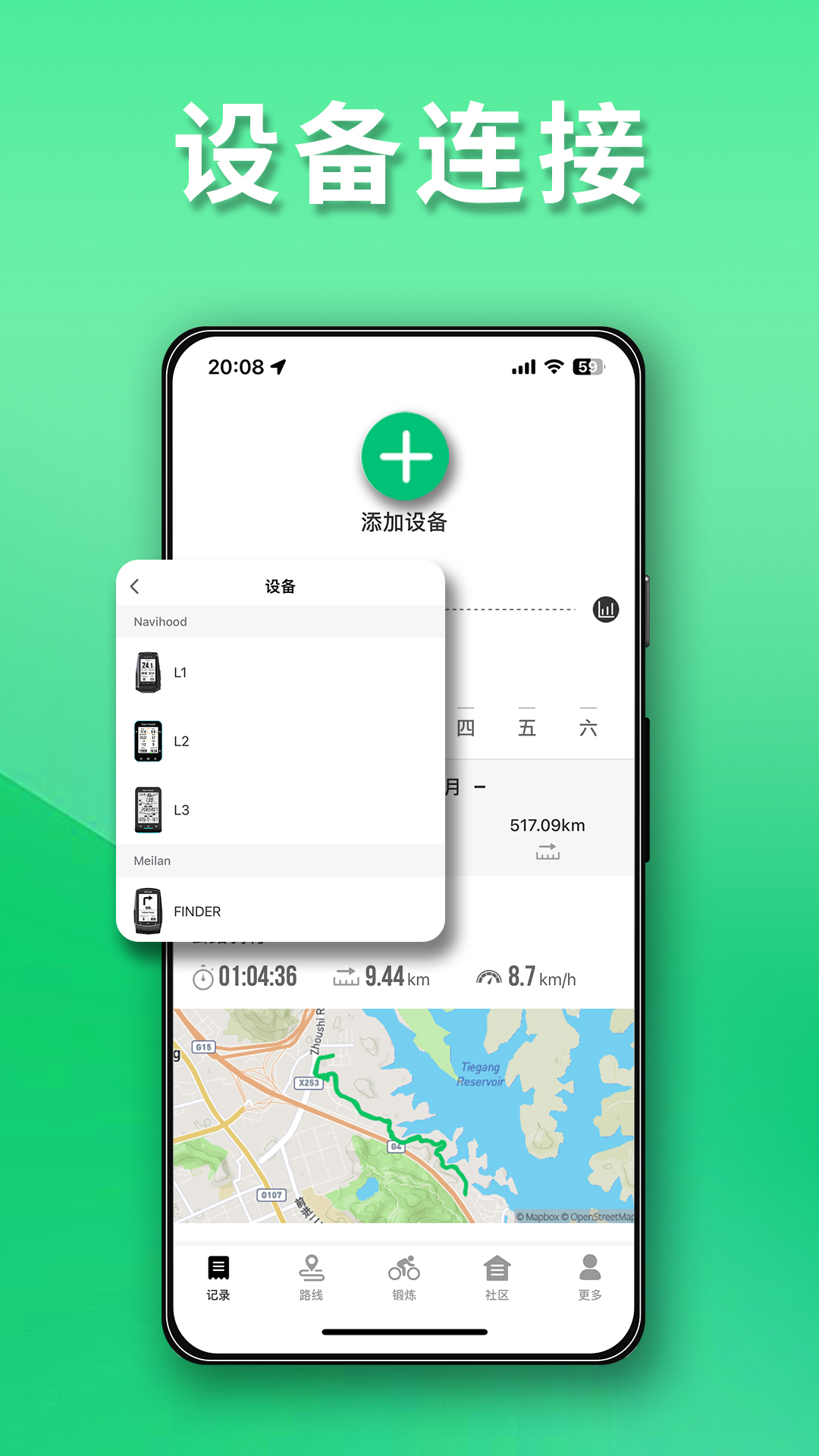 4,锻炼页面:室内骑行适时数据显示,支持APP通过蓝牙连接传感器。