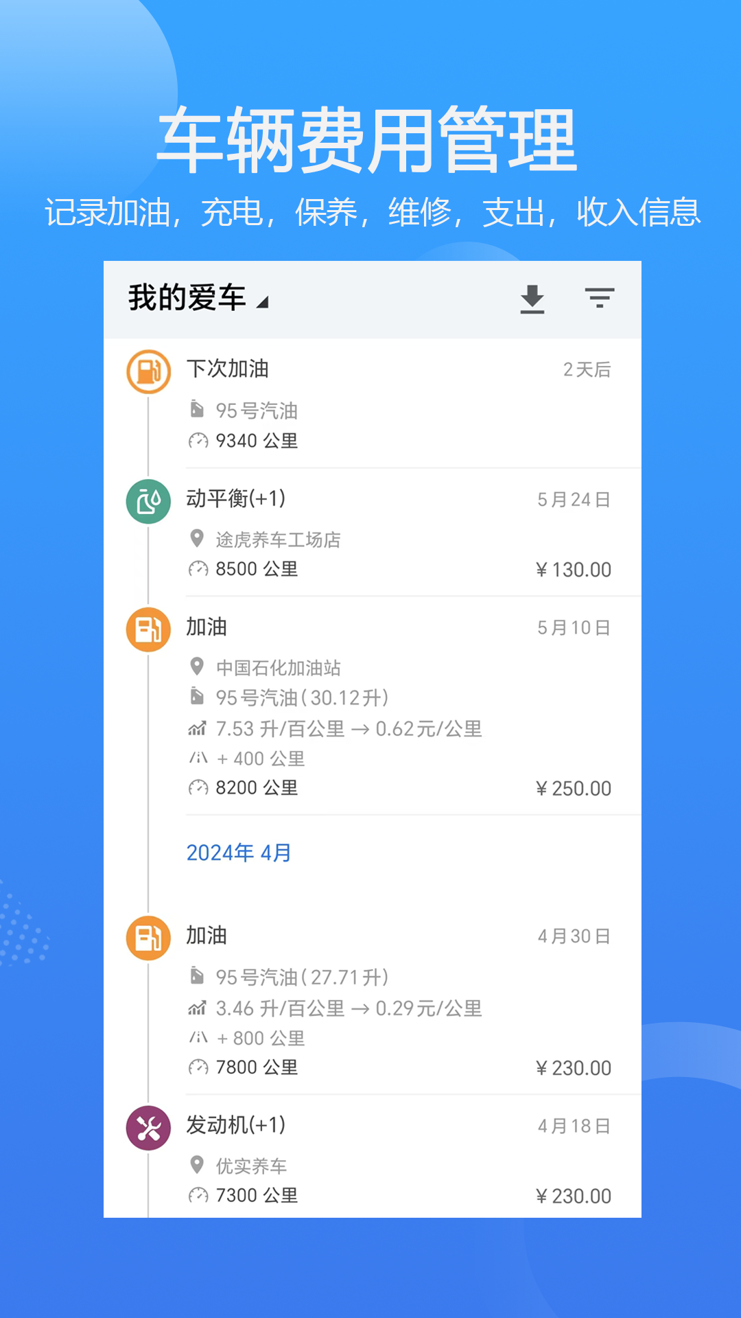 车智管是一款车辆管理软件,可以录入车辆的加油、充电、保养、维修、开支、收入信息,生成完整的车辆花费和收入报告,帮助车主分析并节省车辆开支。