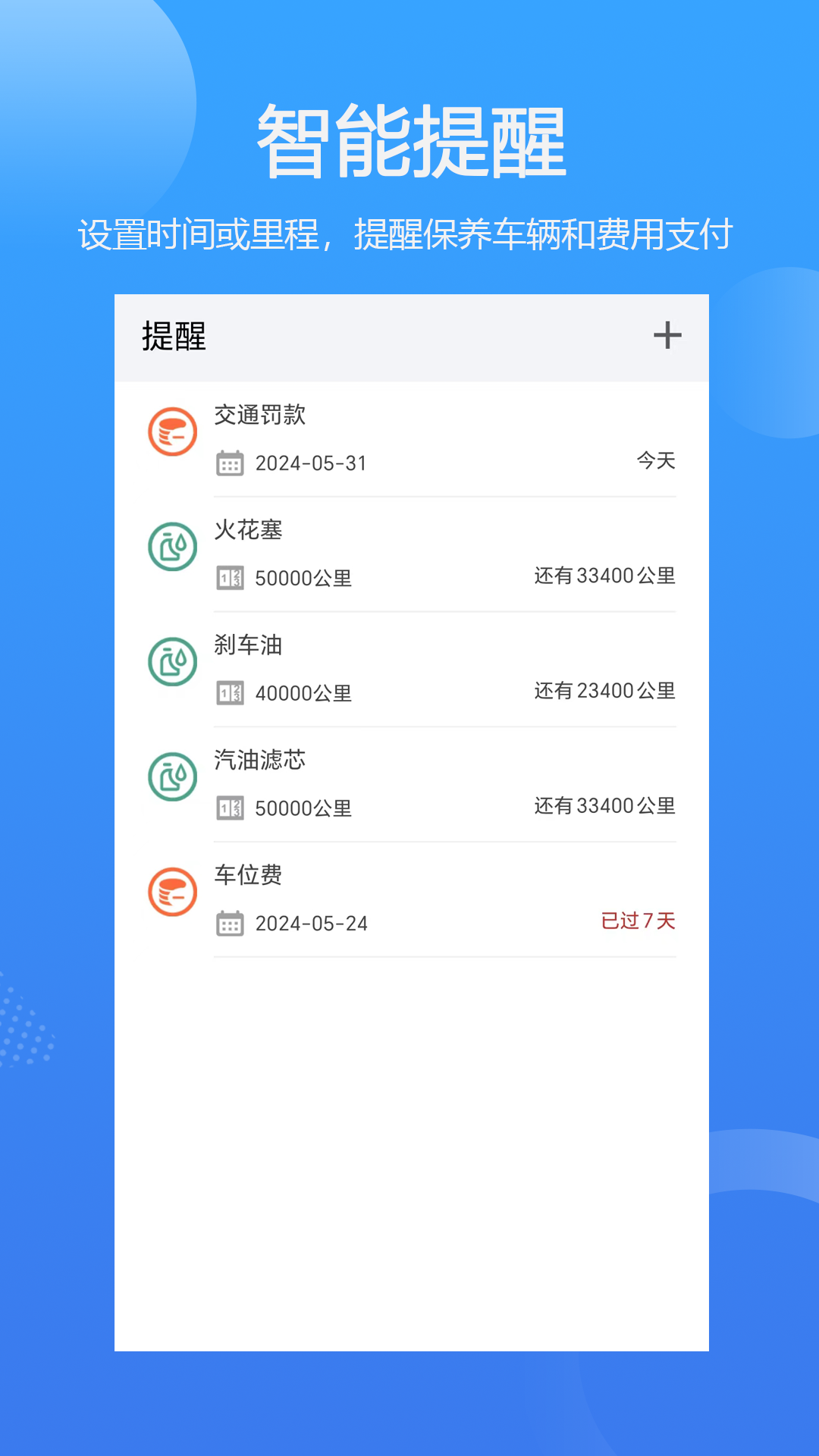 2.提醒:设置时间或公里数,提醒车主保养车辆或支出费用;