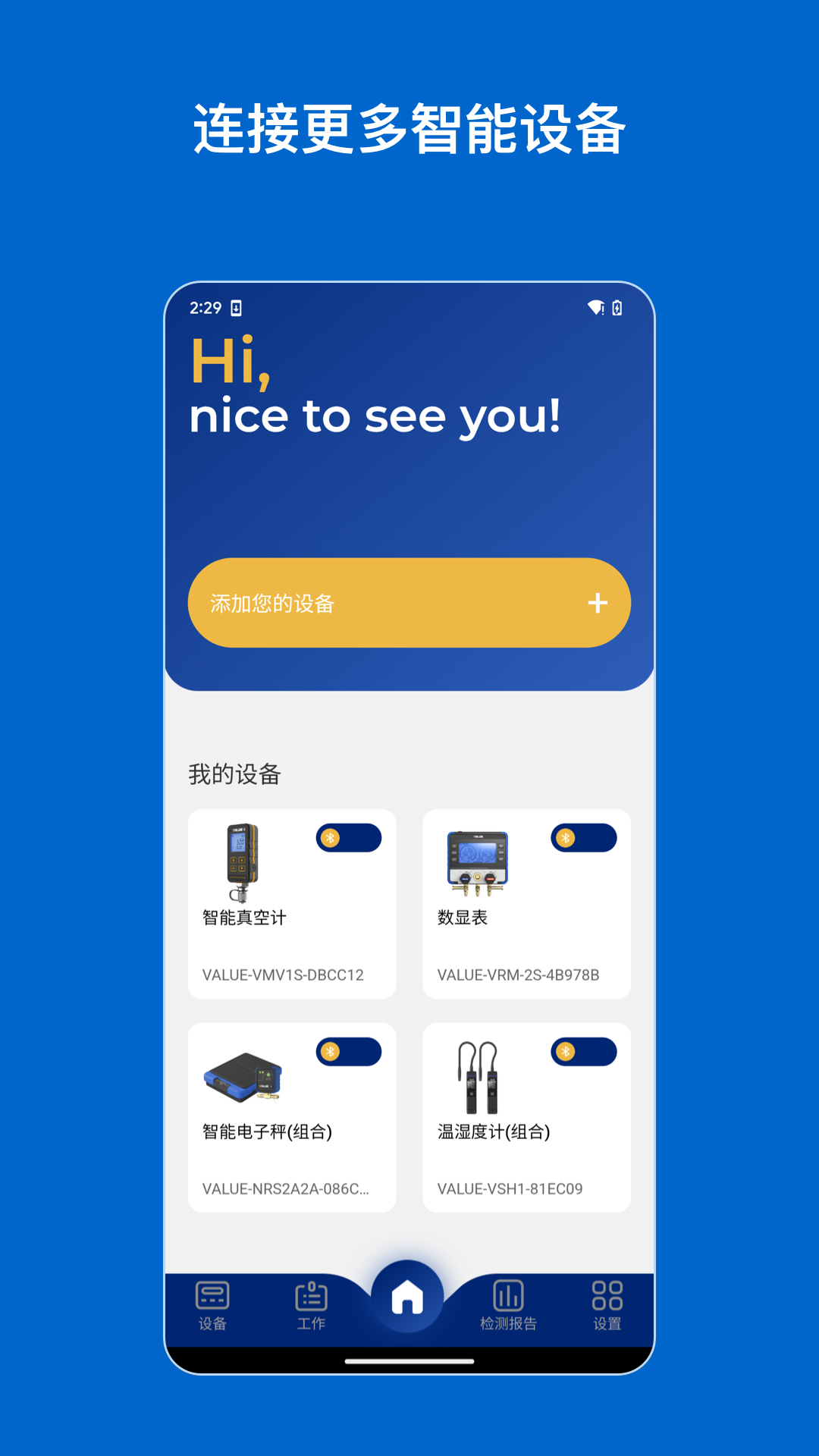 该程序应用于VALUE品牌旗下的物联网平台产品,专业的应用测量程序,通过蓝牙搜索方式快速匹配、添加单个或多个产品,更高效的查看、管理各类产品的测量数据。