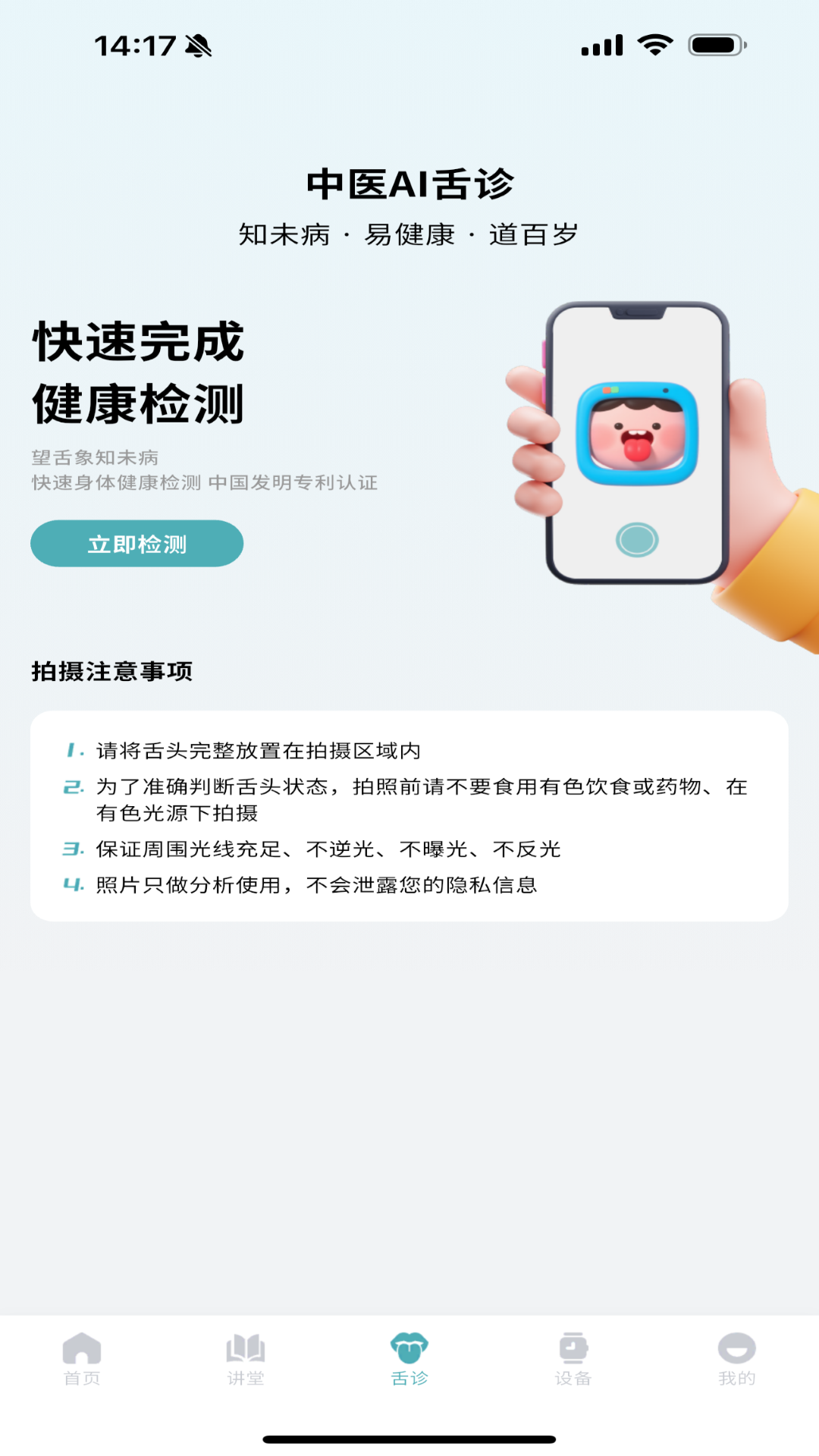舌象舌诊:利用AI技术,分析用户上传的舌象图片,进行病症筛查,帮助了解身体状况,实现提前干预和调理。
