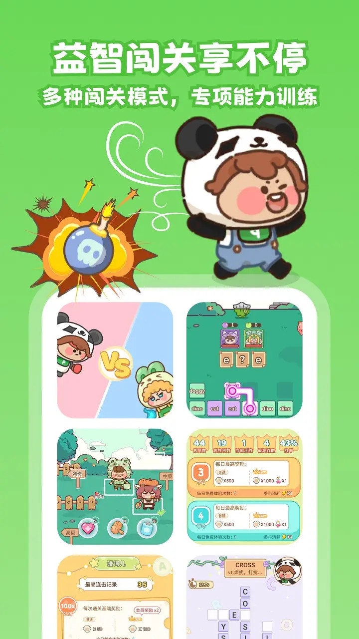 定制6种不同的趣味闯关模式,让孩子在学习的同时得到放松休息,各种不同的 闯关模式锻炼孩子举一反三的能力,逻辑思维能力。