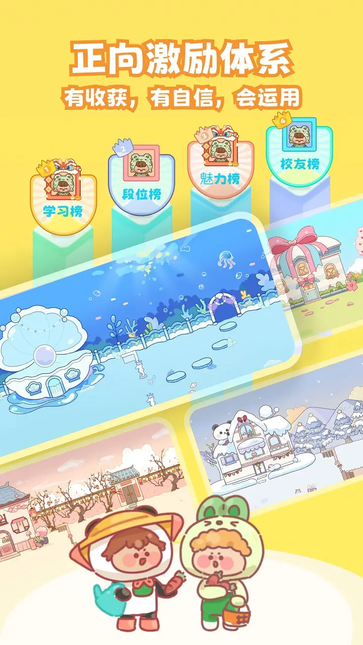 让孩子有兴趣学:不同于其他英语学习产品的督促式,【熊猫在学】多元化丰富模块,设立学习小组,学习伙伴,排行榜等,让学生在学习中有成就感,有伙伴,学习更有动力!