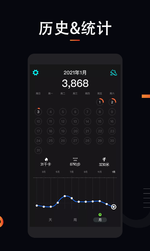 【活动记录】分别对热量消耗、步数、跑步距离进行记录,比绘制日、周、月统计表,记录你每日的运动指标;