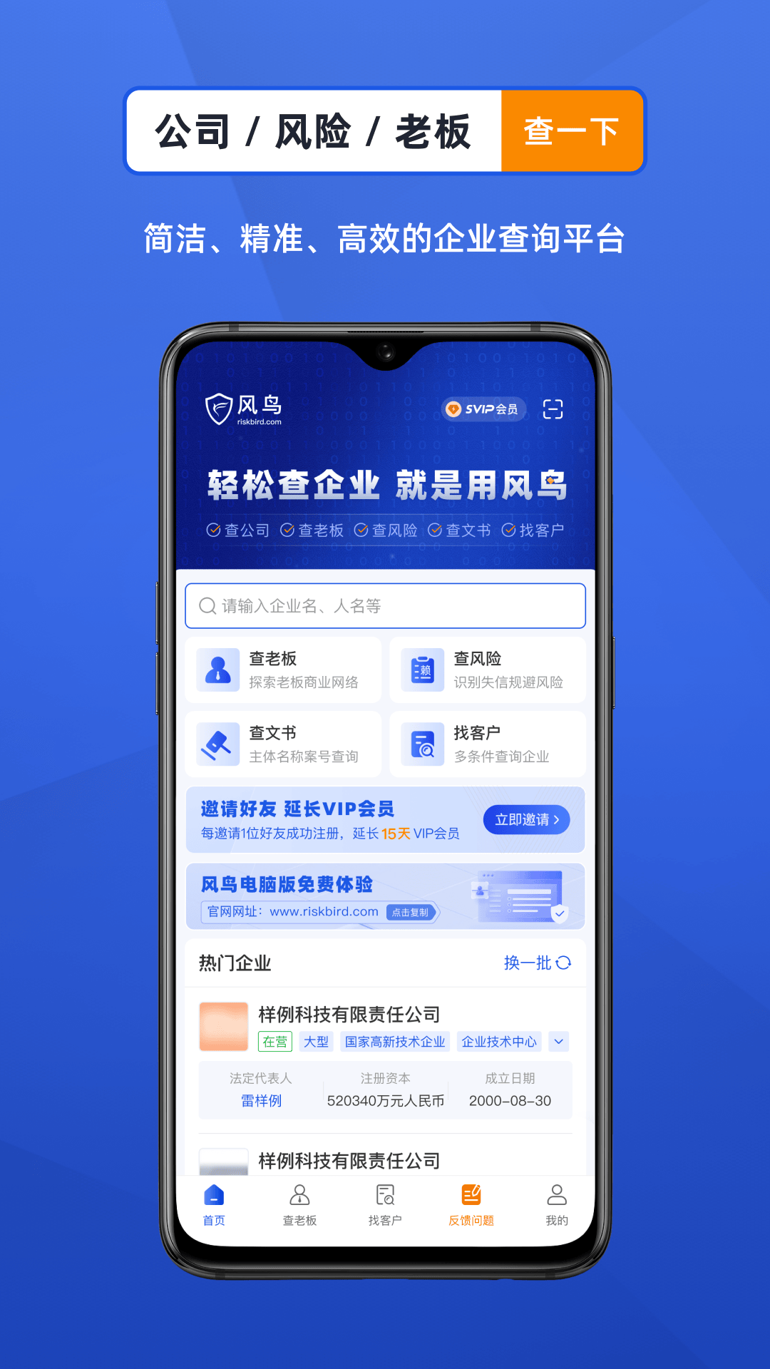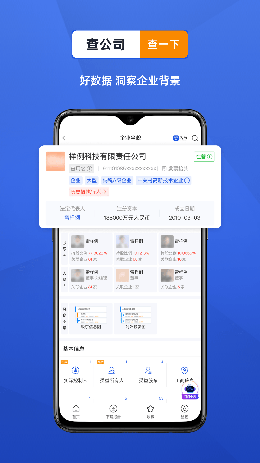 风鸟是一款专业的企业查询监控平台,致力于为专业人士提供便捷的企业信息查询、风险预警监控、关联族谱查询等服务。