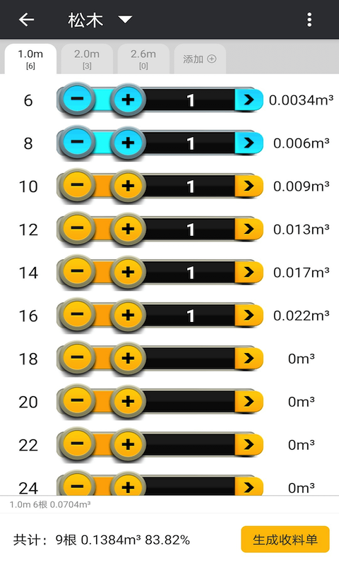 实用的木材行业工具,快速材积计算,材积表查询,可设置不同树种不同长度不同径级的价格,快速计算总价,分类清晰结果明确,可分享计算结果