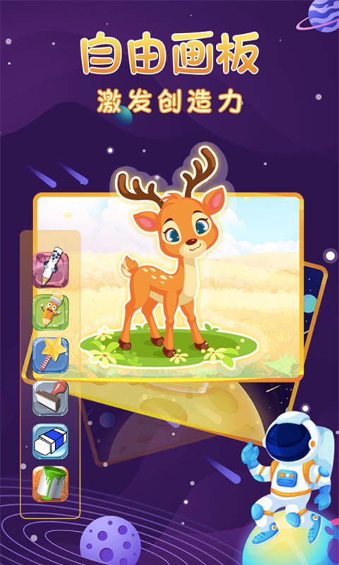 空白的纸张让宝宝的想象力在上面自由挥洒,不同的笔刷带来不同的质感,各式各样的印章给绘画带来了更多乐趣,超多颜色选择,提高宝宝对颜色的感知力。