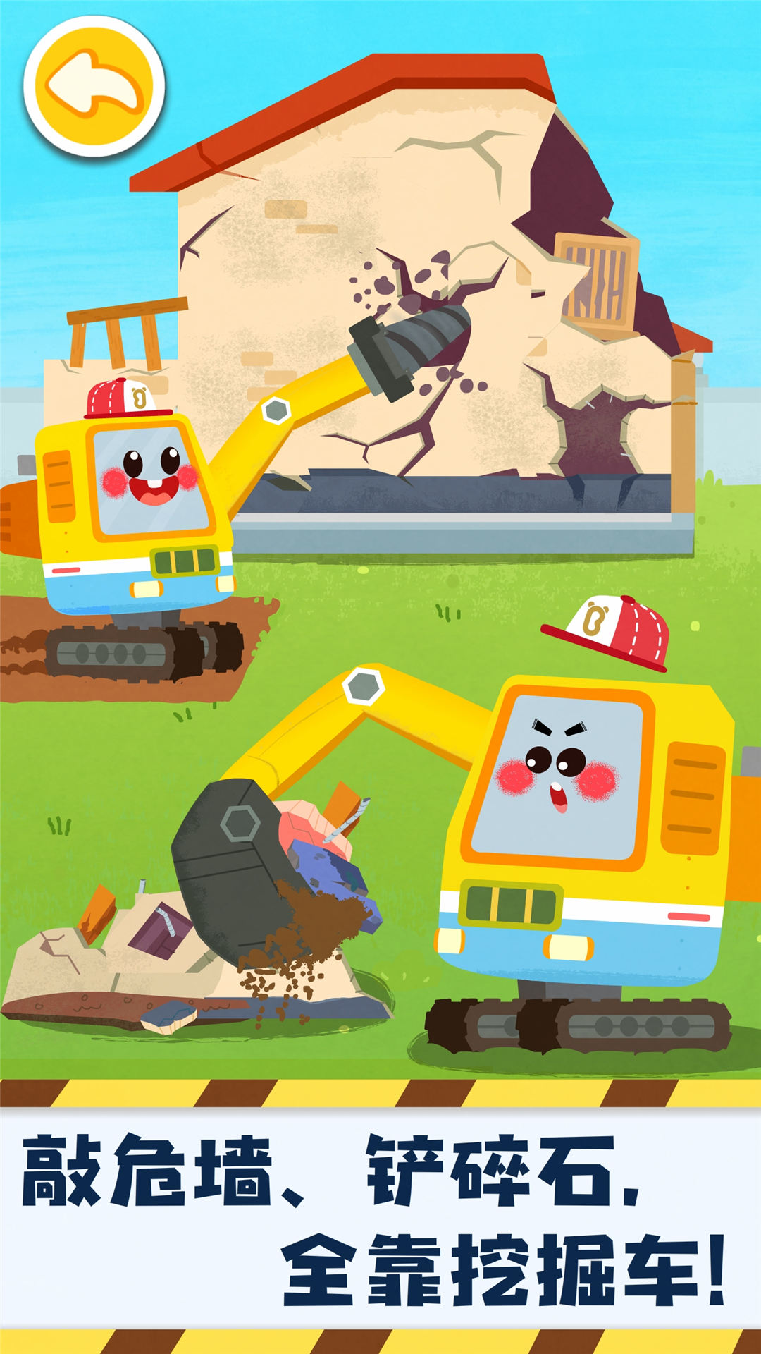 任务来啦,挖掘机队长出动!先换钻头,敲掉旧建筑。碎石、垃圾,交给小翻斗车。