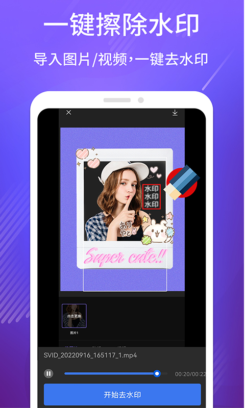 去水印是一款简单实用的水印制作工具,支持视频去水印、图片去水印,以及在图片和视频中添加文字、图片、水印、LOGO等内容,同时软件还支持多种视频剪辑工具,无痕去水印,帮你去除水印烦恼!