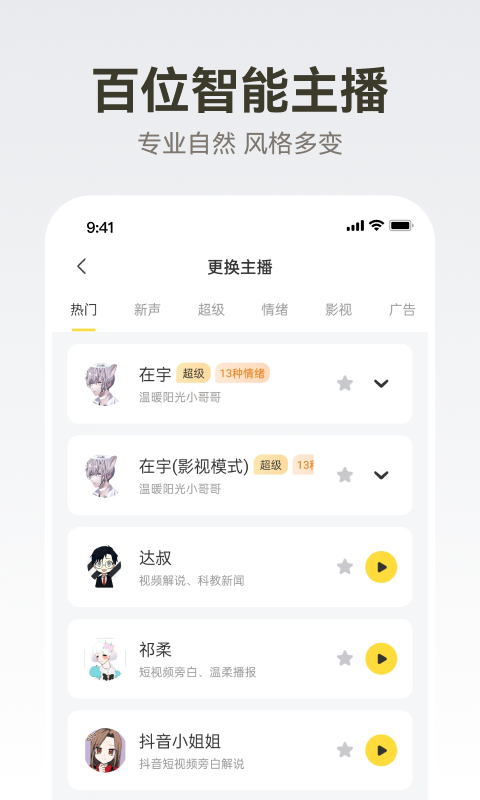 广告促销配音就用广告配音大全。采用智能AI拟人技术,一键文本转化成语音。广告配音再也不用愁,每天更换广告文案,一键生成最新广告音频。我们有男生、女生、方言、外语等多种音色共六百多位智能主播,满足不同广告需求