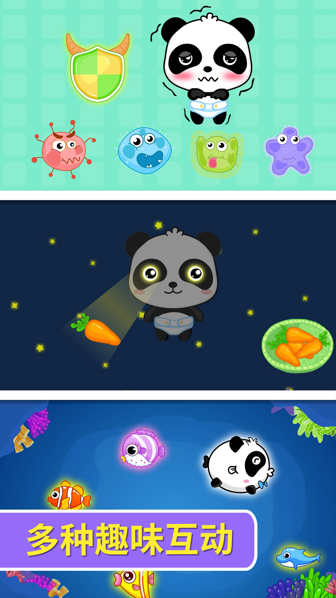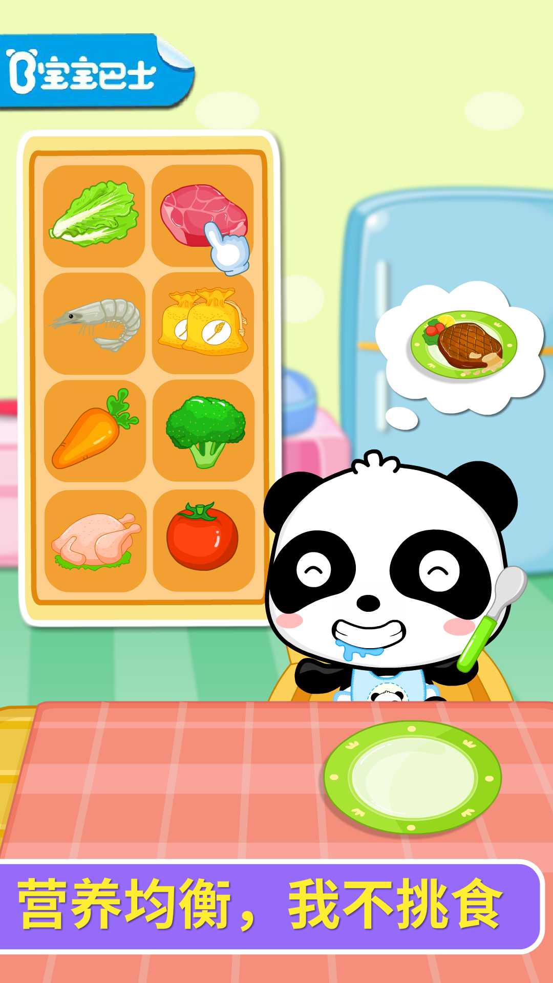 喂小熊猫吃饭,观察TA的反应,还有好多趣味互动等着宝宝来体验! 宝宝在趣味互动中,就能了解各种食物的优点,改掉挑食偏食的坏习惯,做个爱吃饭的好宝宝。