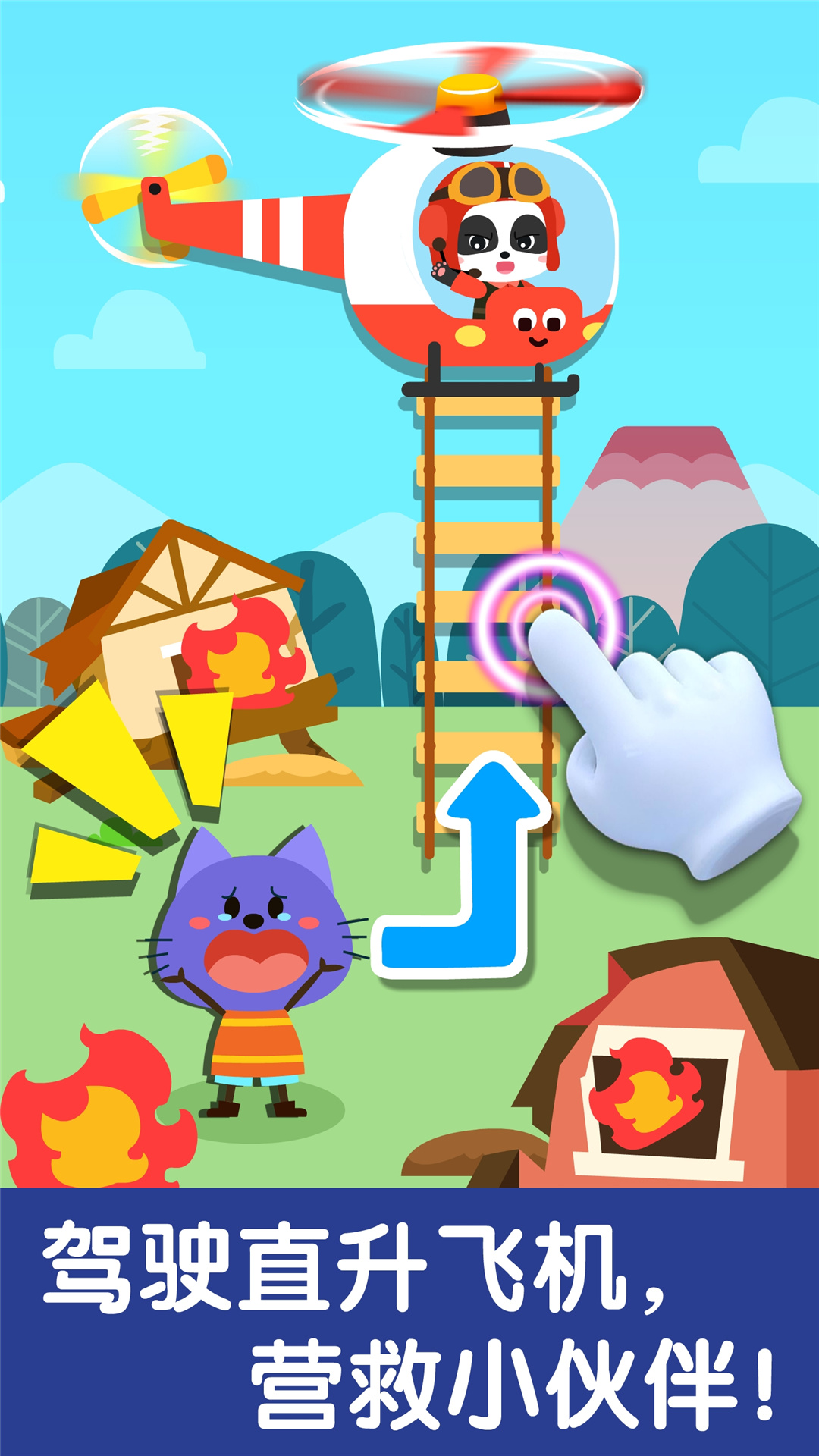 城堡着火了。驾驶消防车,参与灭火行动。小伙伴被大火困住?从车上拿出消防水枪,瞄准大火、冲水,耶!成功扑灭火源。