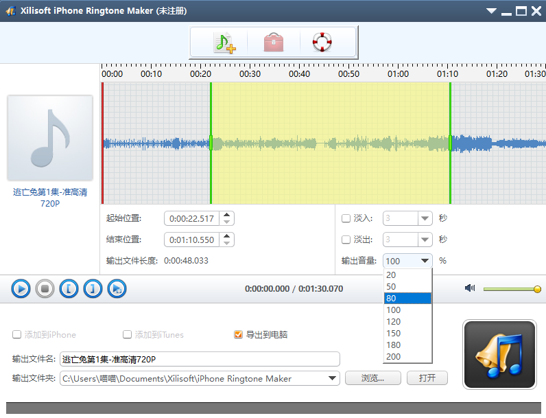 2.可以直接在时间轴上设置要作为铃声的片段(设置开始时间与结束时间)