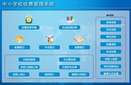 ??收费管理:设置收费学期名称、创建收费名单、应收项目赋值、收费录入 、批量打印收费单据、补交录入、退费录入、和临时收费。