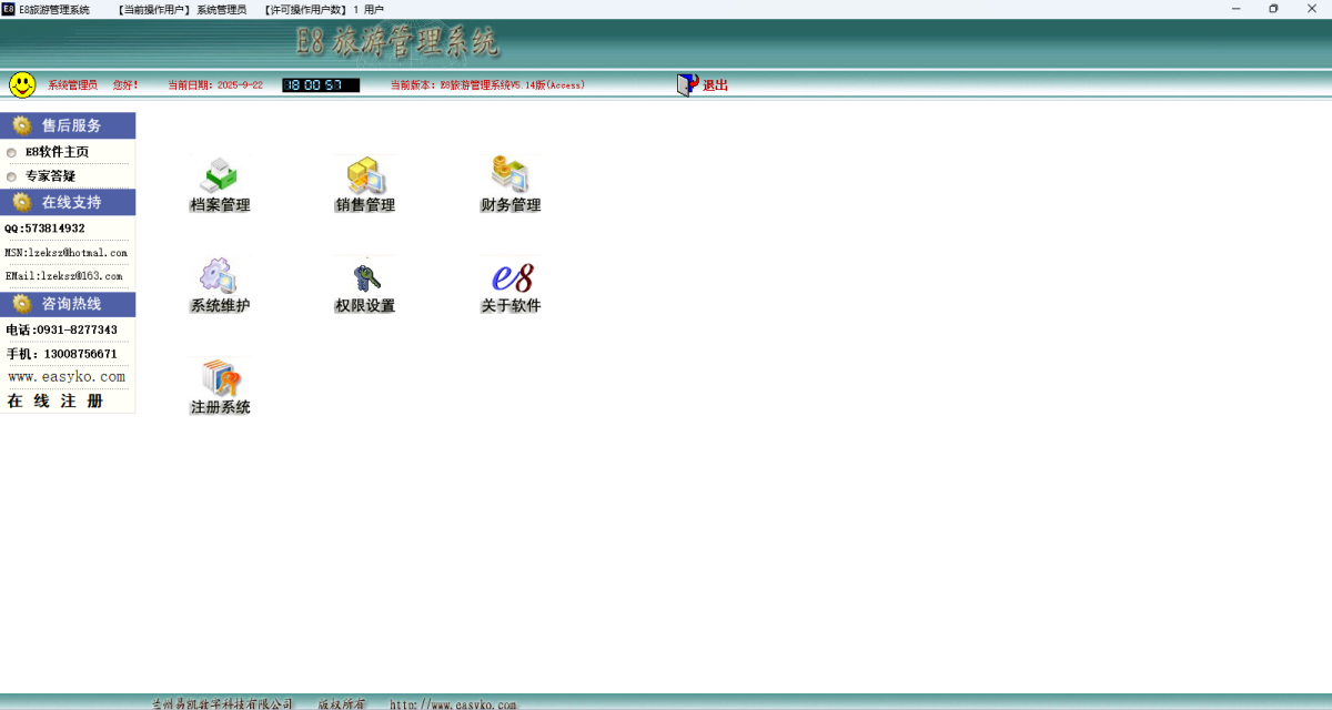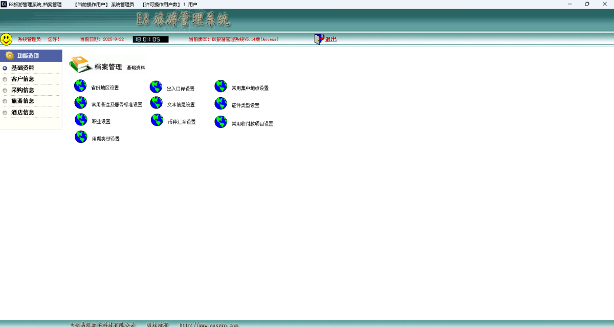 E8旅游管理软件是专为旅行社、旅游公司、相关旅游行业而开(发)的,包含出境游、国内游、 港澳游、入境游、国内地接、省内短线、计调、财务结算、客户关系管理、网络营销等多项内容的全方位的信息管理系统,可以帮助旅行社、旅游公司、旅游相关行业在基础信息管理、直客销售、计调操作、同业分销、财务结算等各方面进行综合的管理。它是一套为旅行社、旅游公司、旅游相关行业量身订做的企业资源计划ERP)、客户管理管理系统(CRM)。