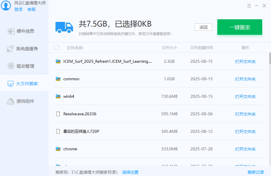 智能检测占用磁盘大文件,并进行搬移,支持批量操作,快速解决电脑运行卡顿问题