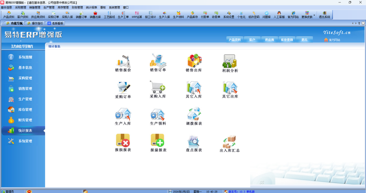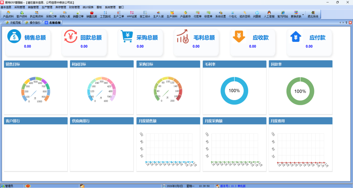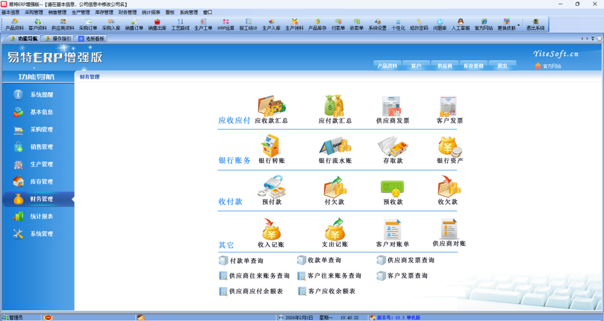 易特ERP增强版在ERP标准版的基础上增加工艺路线,生产工单,扫码报工,计件工资等模块,软件覆盖整个生产企业所有部门的管理、采购、销售、仓库、生产、财务,可自定义界面、布局管理;灵活的打印样式设计,业务流程清晰,操作简单。