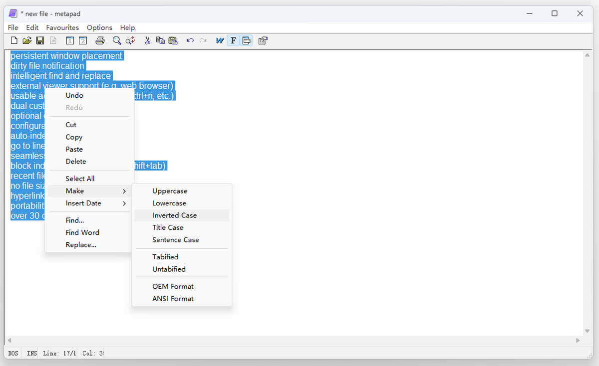 Metapad 是一款小巧、快速的 Windows 文本编辑器,功能类似于 Microsoft 记事本,不受文件大小的限制,可以开启超大型的文件,所见即所得的打印;支持 DOS 文本、UNIX 文本以及 Unicode、Unicode BE 格式的文件。另外还有诸如自动缩进,自定义制表符长度,支持收藏夹以及在 Windows 2000 下支持透明模式等等自己的特色。