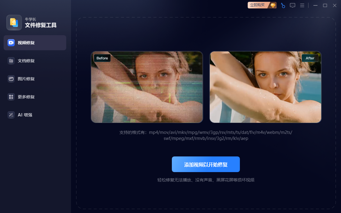 牛学长文件修复工具可修复在拍摄、录制、传输、编辑、转换或处理过程中导致视频损坏、无法打开、没有声音、黑屏、花屏、播放报错的等问题视频!