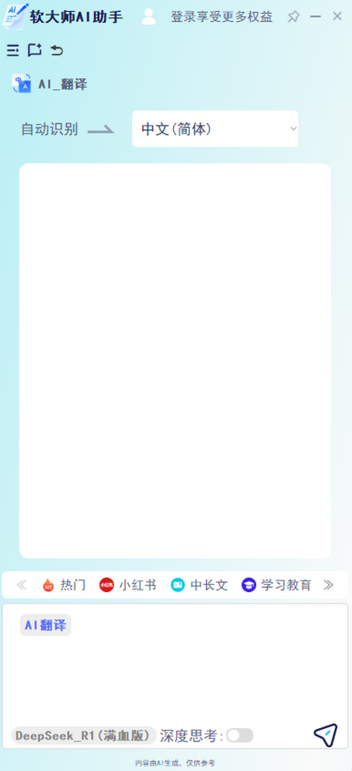软大师AI桌面助手是一款集AI写作、AI翻译、电脑桌面整理等功能为一体的软件,支持几十款预制AI创作模板,支持AI办公总结、报告、策划、方案等,自动识别语言,支持多种AI语言翻译,接入DeepSeek满血版大模型,快速进行AI搜索,可以按功能分类,快捷查找桌面软件。