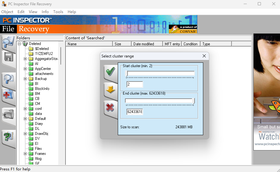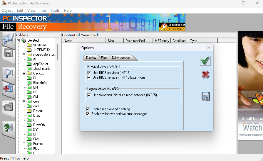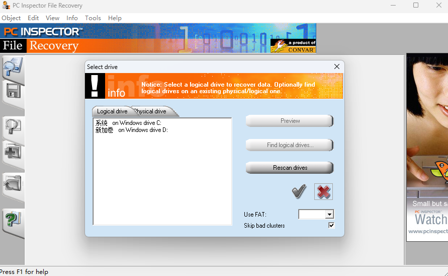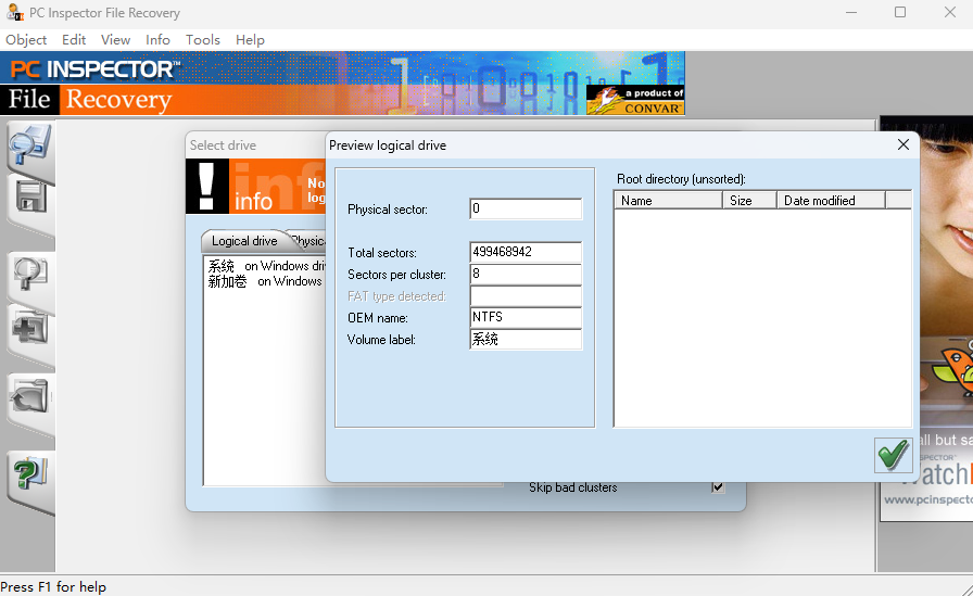 PC Inspector File Recovery是一款数据恢复软件,支持 Fat12/16/32 和 NTFS 文件系统,可以恢复磁盘、软盘、可移动磁盘等存储设备上的数据。适用于错误删除、快速格式化、系统崩溃、中病毒后杀毒软件删除文件等文件丢失情况。