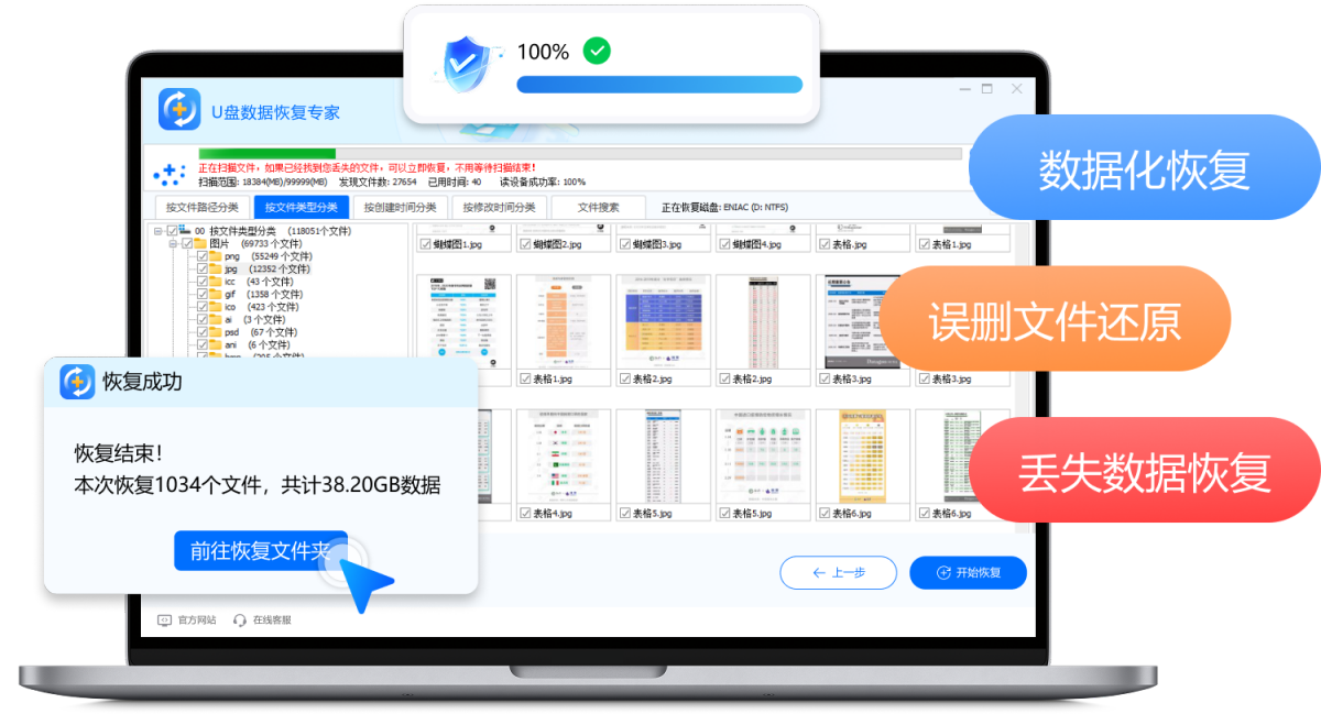 复杂场景:U盘格式化(快速/完全格式化)、病毒加密(如Incaseformat病毒隐藏文件)、分区表损坏(提示“未格式化”“RAW格式”),通过重建文件索引与扇区数据重组技术,恢复成功率仍可达78%-85%