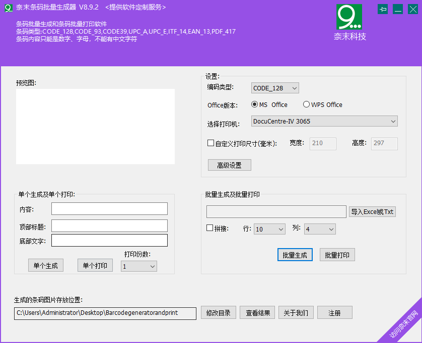 奈末条码批量生成器免费版是一款条形码批量生成和条形码批量打印的专业软件,支持Code128、Code93、Code39、UPC_A、UPC_E、ITF、EAN_13、EAN_8、PDF417等条码格式,支持导入Txt和Excel模板批量生成和打印。条码图片生成格式可选择PNG,JPG,BMP。本软件是绿色软件,免安装,解压即可打开软件。支持软件定制。