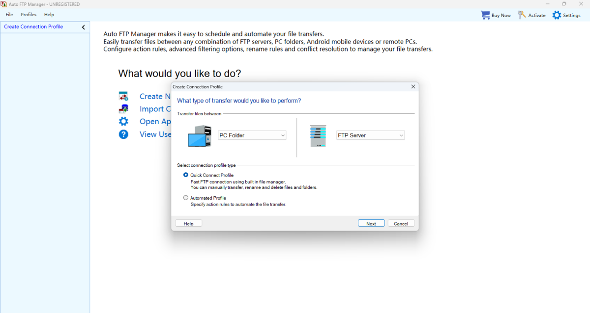 Auto FTP Manager不止是一个托管文件传输工具。易于使用的向导帮助创建动作规则,定义要传输哪些文件和文件夹。自动传输配置文件可以上传或下载从单个文件到整个文件夹的任意内容,或同步两个目录。高级过滤器根据文件类型、名称、大小或修改日期控制传输或删除文件。