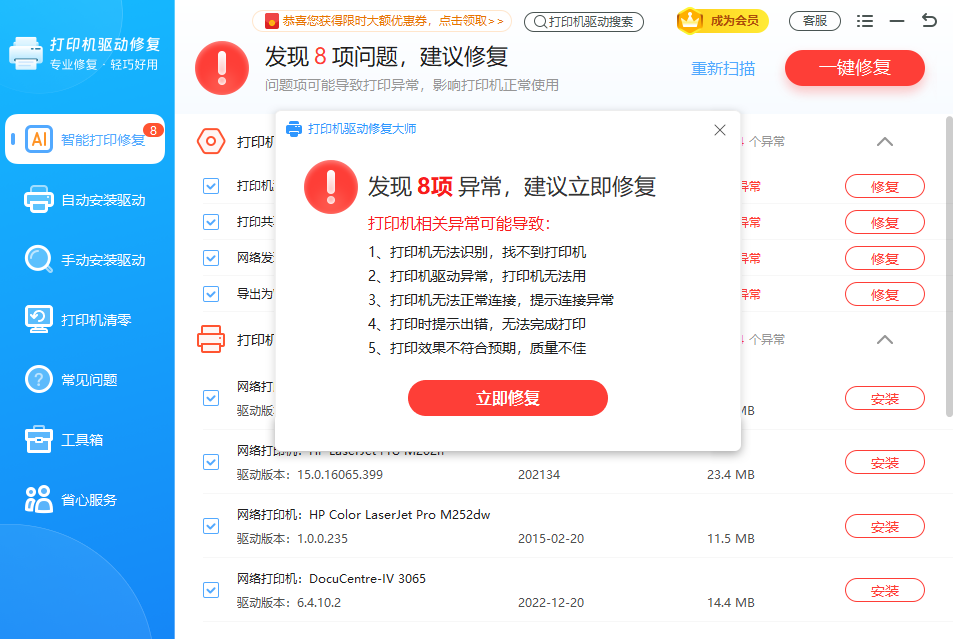 打印机驱动修复大师,全面智能诊断修复打印机错误、驱动故障、打印机连接问题等,拥有全品类打印机驱动库,一键搜索安装升级最新驱动,软件轻巧无广告,技术专家远程在线1对1服务。