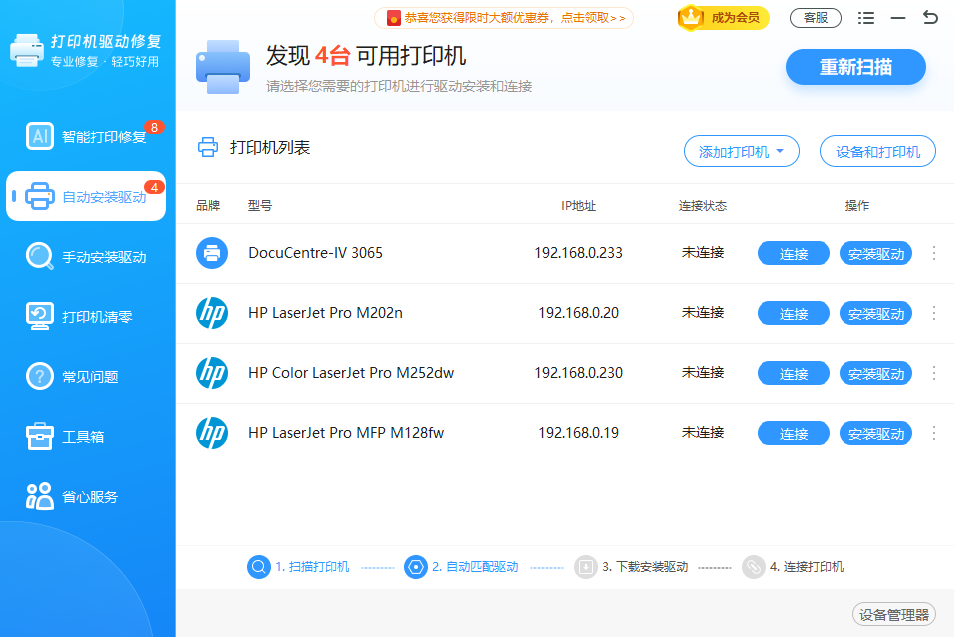 自动识别打印机驱动,高速下载一键安装