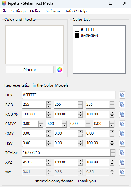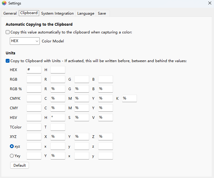 处理:只需单击一次,您就可以将颜色模型的所有值复制到剪贴板,以便立即在其他应用程序中使用它们。因此,你可以决定有多少位小数应该使用和是否单位或其他个人控制的字符将复制之前或背后的价值。