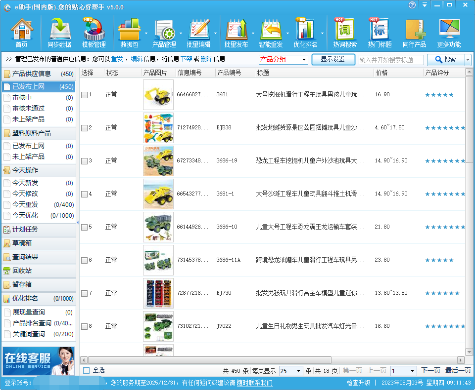 · 支持全行业批量发布产品信息,海量数据批量导入,轻松达到5星级。