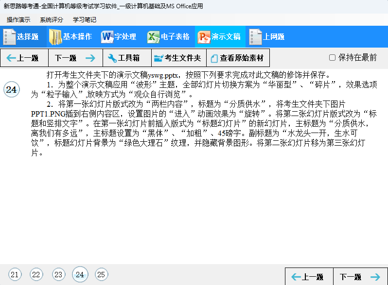 无纸化考试在中文版Windows系统环境下运行,用来测试考生在Windows的环境下进行系统操作、字处理、电子表格、演示文稿、选择题(计算机基础知识和微型计算机系统的组成)以及上网操作的技能和水平。