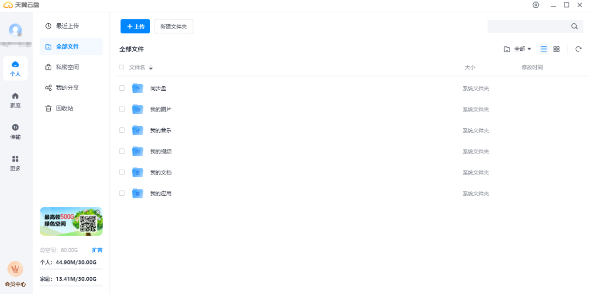 答:目前,天翼云盘免费提供30G个人云空间、30G家庭云空间,您可以通过订购会员套餐获得更多空间。