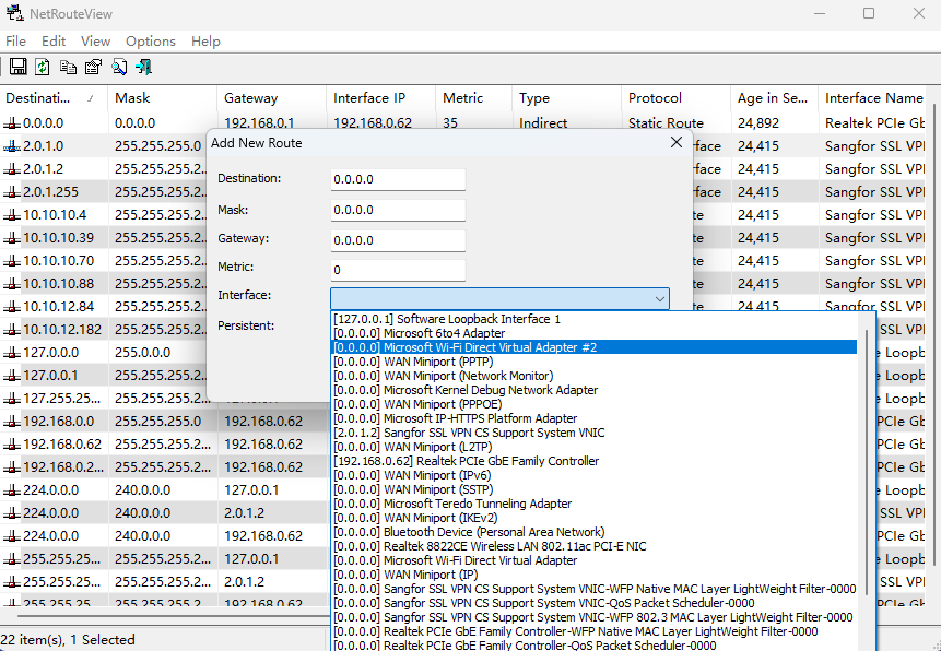 软件显示了当前网络上的所有路线清单,包括目的地,掩码,网关,接口的IP地址,公制值,类型,协议。NetRouteView主窗口显示您的所有网络路由列表,如'打印'在Windows路由实用程序的命令。你可以选择一个路线,然后将其删除(Del键)或修改它(按Ctrl + M)的。请注意,与'静态路由在本议定书仅列值的路线,可以删除或修改。也可以通过使用'新干线'选项(按Ctrl + N)的一个新的路径。