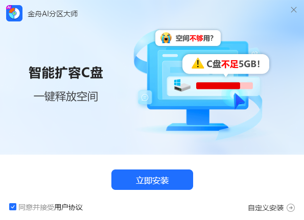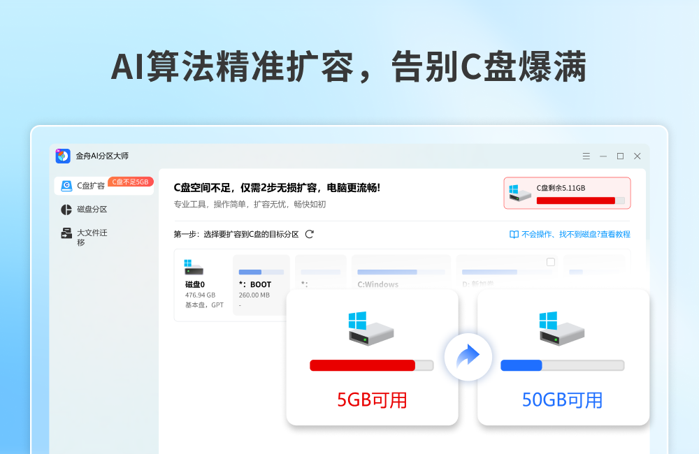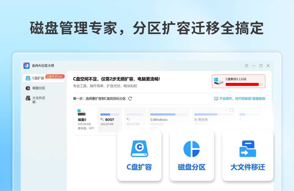 C盘扩容,磁盘分区,磁盘管理,分区助手,分区管理,还在为C盘爆满、系统卡顿而烦恼吗?金舟AI分区大师 - 您的智能磁盘空间管家,运用先进AI算法,为您提供智能、安全、高效的磁盘管理解决方案,彻底告别空间不足的困扰!