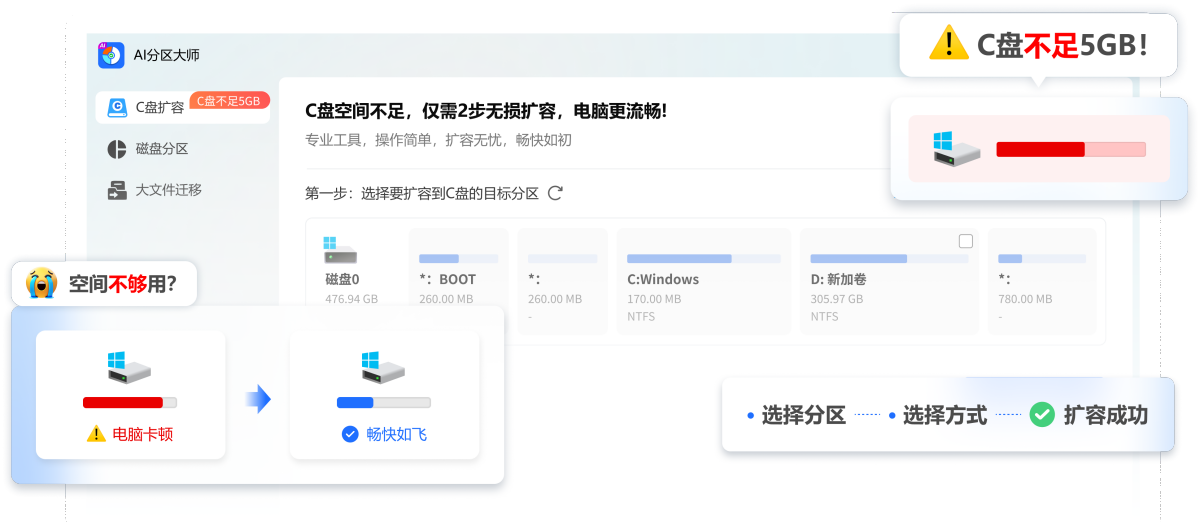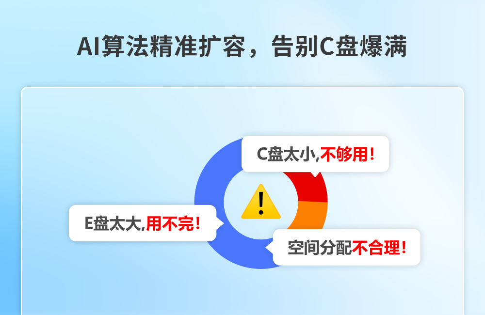 一键解决C盘空间告急!AI深度分析磁盘使用情况,智能推荐最佳扩容方案,精准调整分区大小,无损数据安全,瞬间释放宝贵空间,让系统运行重获流畅。