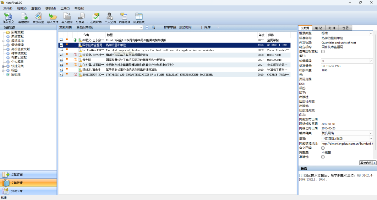 NoteFirst 文献管理软件是一款文献管理、论文写作及科研协作工具。主要功能包括文献收集管理、论文写作帮助、科研协作交流以及学术信息搜索。NoteFirst 基于互联网, 可以多台电脑数据可以自动同步,并且全面支持国家标准,并满足SCI、EI 等收录中文论文要求双语参考文献的格式要求。